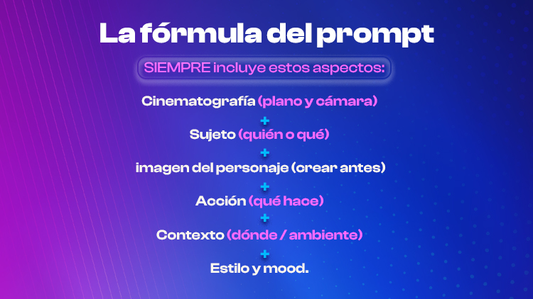 Un prompt para Veo 3.1 no es un mero listado de deseos visuales. Es una guía de dirección similar a un guion cinematográfico, que comunica a la IA lo que quieres ver, sentir y escuchar. Cuanto más estructurado y detallado sea, más control tendrás sobre el resultado final.
